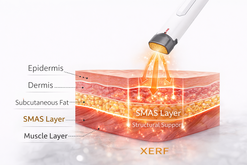 Unlike superficial treatments, XERF works where structural aging begins—deep within the support system of the skin.